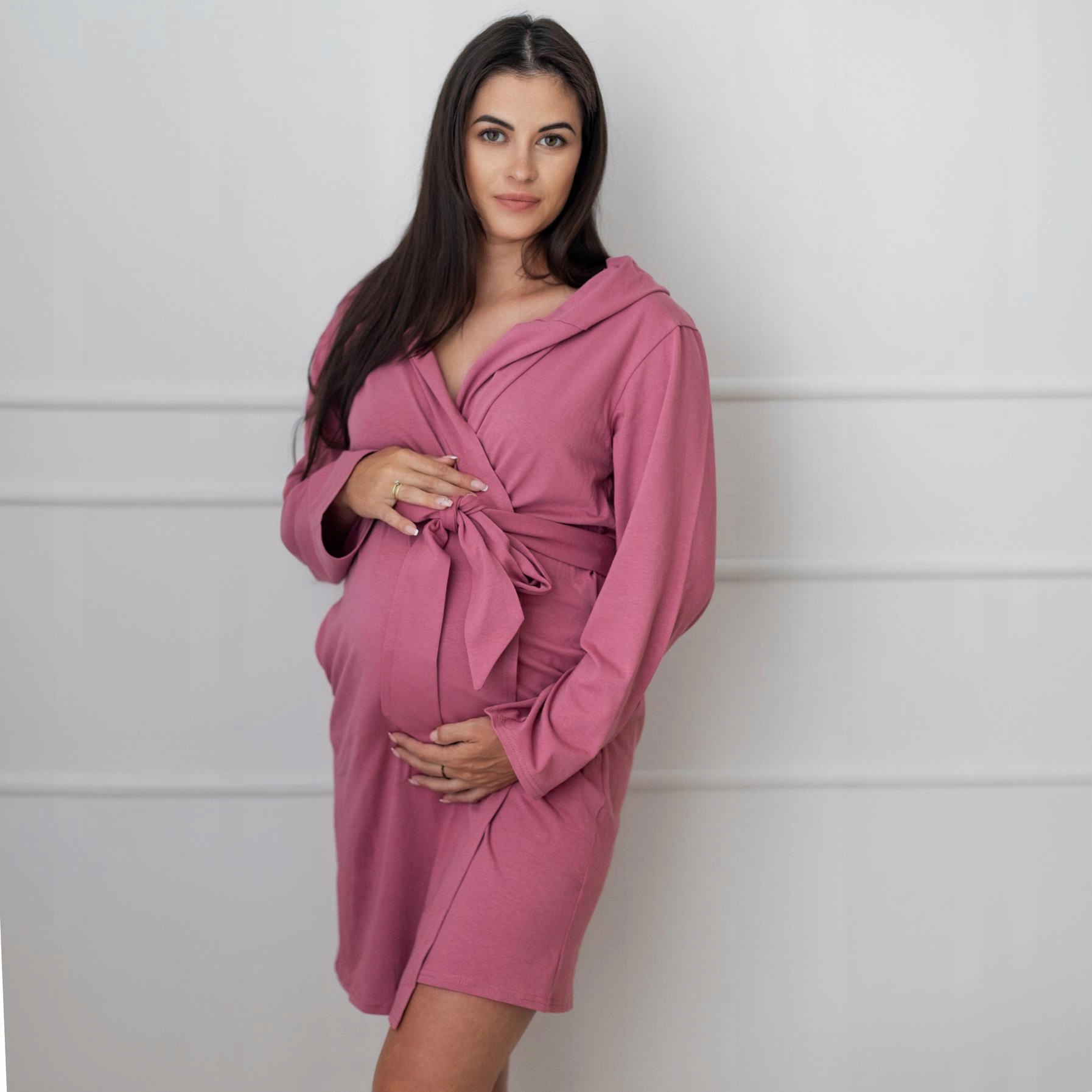 Wygodny szlafrok do szpitala dla mamy na poród uniwersalny kaptur różowy